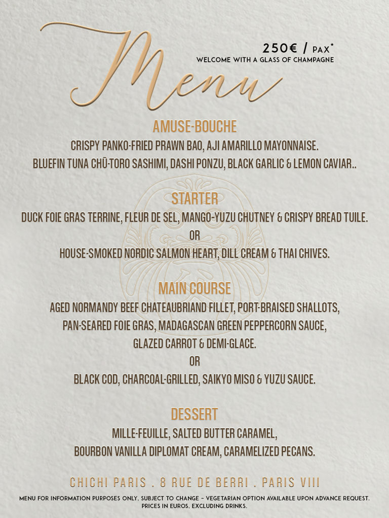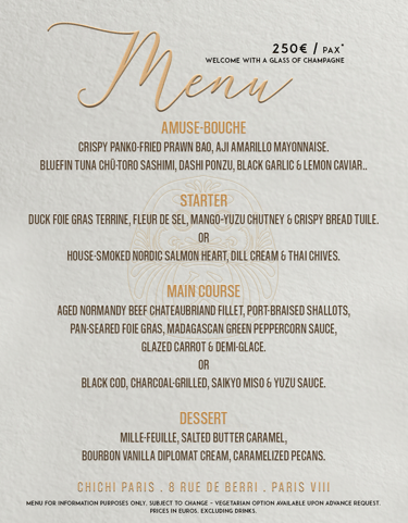 A true celebration of taste, Chichi Paris invites you to ring in the New Year with an exclusive culinary experience blending French elegance and world-inspired creativity.