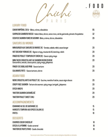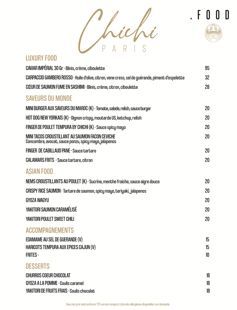 Qu’il s’agisse de partager nos plats autour d’un verre ou de savourer nos plats signatures, le menu de Chichi Paris est conçu pour éveiller les papilles et prolonger l’esprit festif du lieu, entre luxe et gourmandise.
